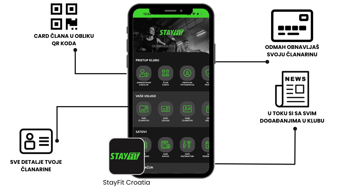 Preuzmi StayFit aplikaciju i učlani se u par koraka – digitalna članarina aktivira se odmah, a u klub ulaziš QR kodom na mobitelu. Sve upravljaš u jednoj aplikaciji: članarina, plaćanje, pregledi i pogodnosti.